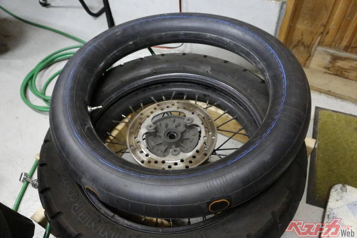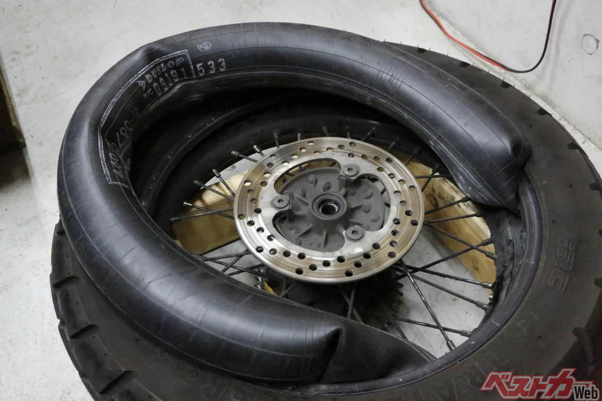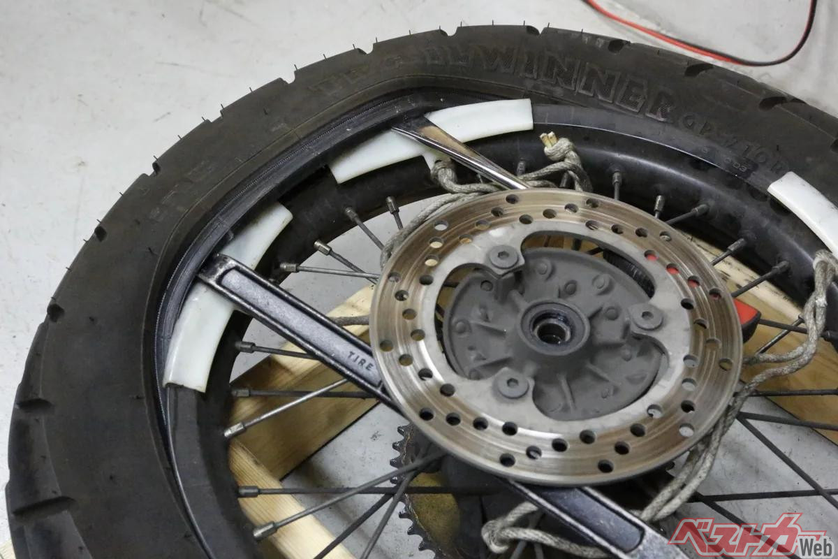 ここに釘やガラス片が刺さってタイヤのトレッド面を通過してチューブに穴が開くと、トレッド面に異物が残っていてもチューブ内の空気がタイヤの内面に漏れてしまうため、チューブレスタイヤに比べて短時間で、場合によっては一気に空気が抜けて操縦安定性に影響を及ぼします。自転車でパンク経験のあるライダーなら、タイヤの空気が一気に抜ける感覚は分かるはずです。