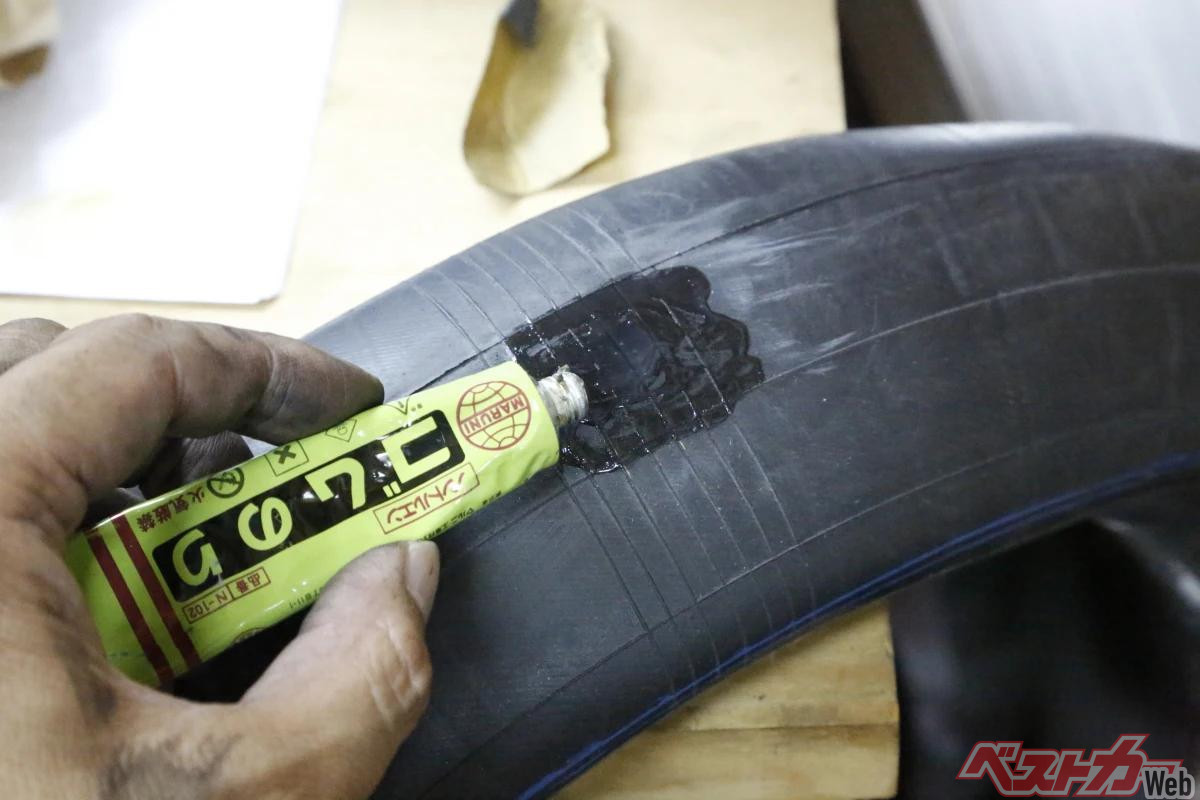 またゴムのりは単なるゴム系の接着剤ではありません。昔はトルエンタイプが一般的でしたが、現在では有機溶剤を含まず人体や環境に優しい製品となり、中には補修後に走行することで発生する熱によってパッチとチューブを化学的に一体化させる加硫接着を行うのりもあります。