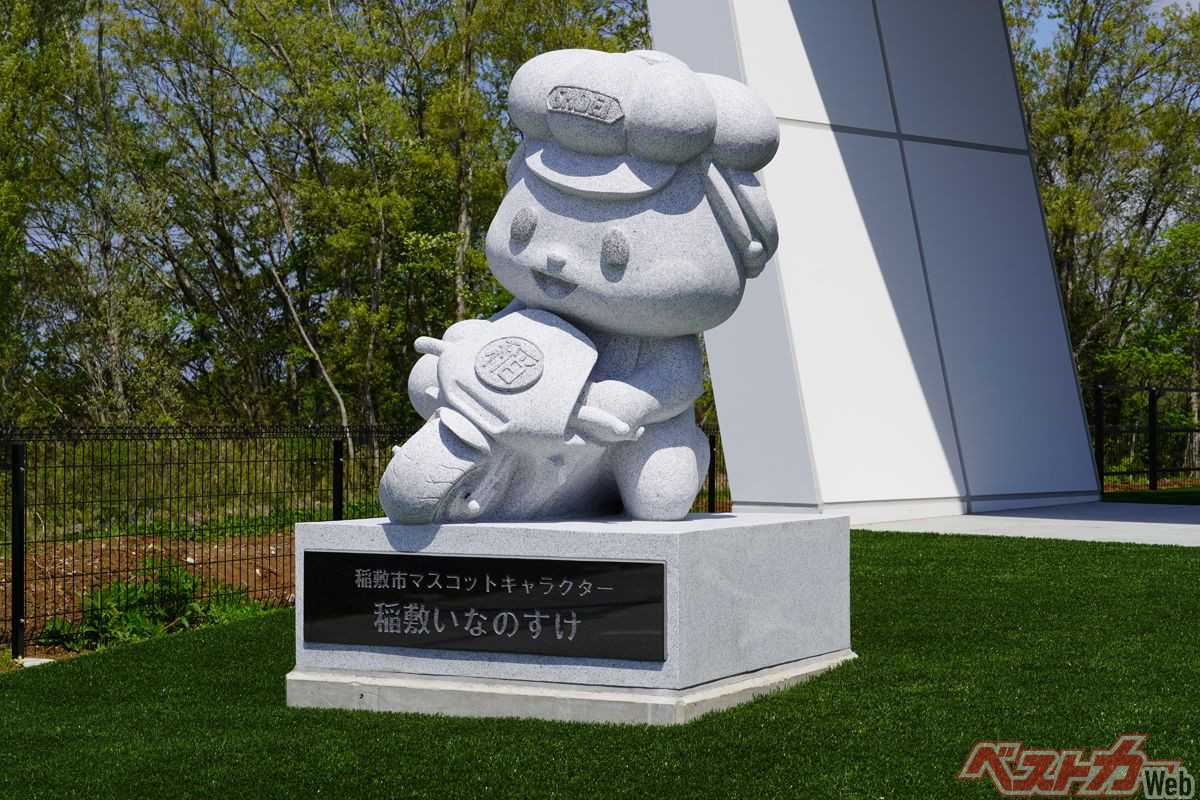 エントランスでは稲敷市のマスコット「稲敷いなのすけ」が膝スリでお出迎え。