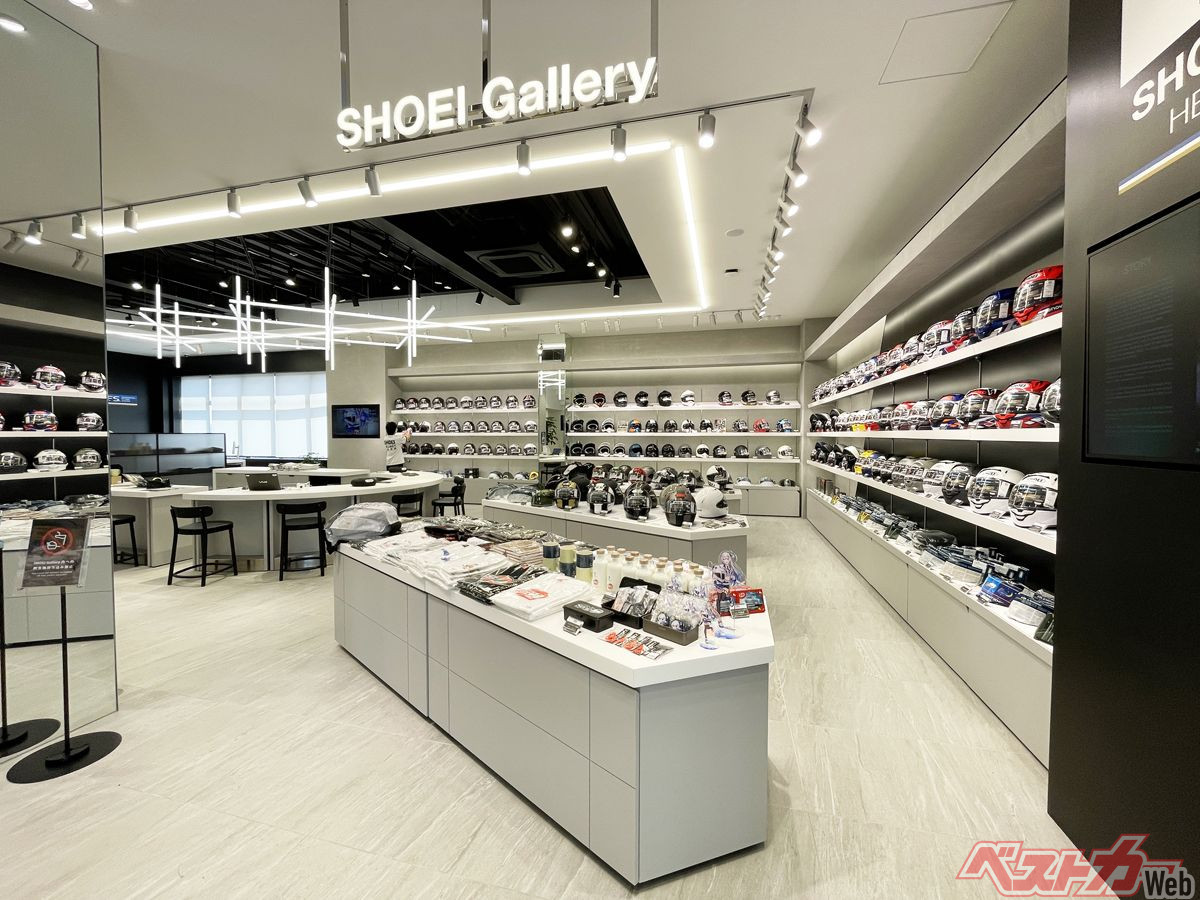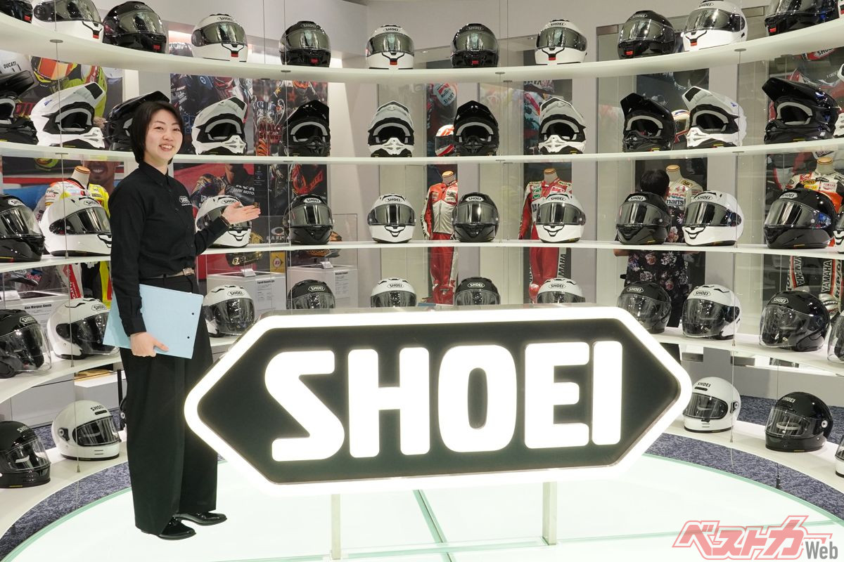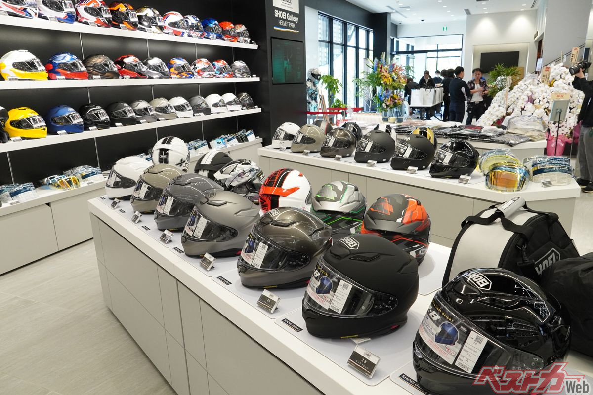 SHOEIの現行全ラインナップが並ぶショールーム。購入やフィッティングサービス「PFS」の実施も可能。