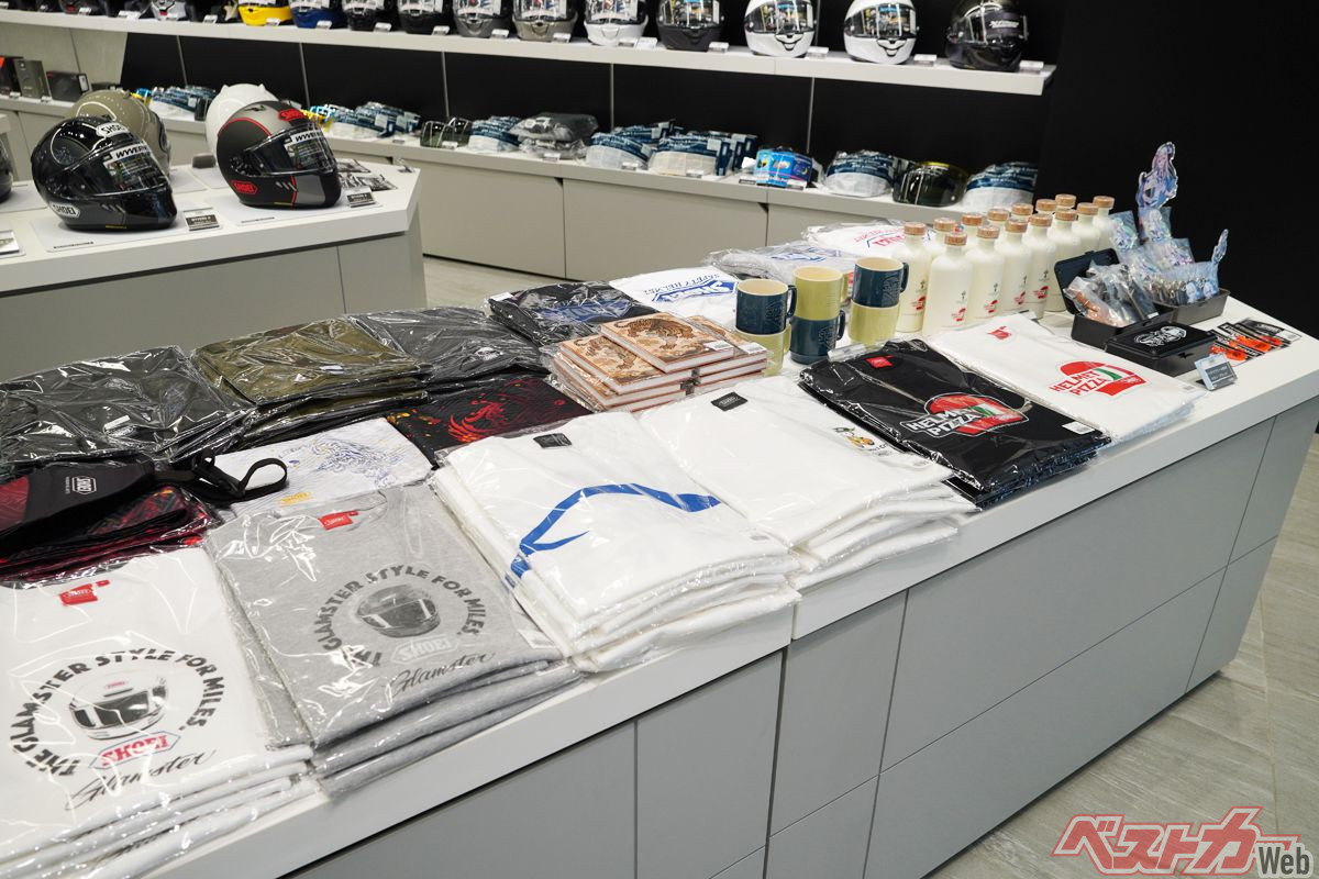 ヘルメットのシェルをイメージしたロゴTシャツや「いなのすけ」とのコラボグッズ、瓶入りオリーブオイルなど、HELMET PARK店だけの限定グッズも。