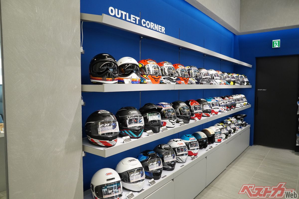 ヘルメットパーク1階にはSHOEIの現行モデルをすべて網羅し、試着や購入が可能なショールーム「SHOEI Gallery HELMET PARK店」がある。ここの目玉は同店限定のアウトレットコーナー。展示で使われた廃番モデルや、軽微な傷や汚れがある製品を定価の15〜25%オフで販売している。ただし、どんなヘルメットがあるかは来てみないと分からない。まさに「来てのお楽しみ」というコーナーだ。