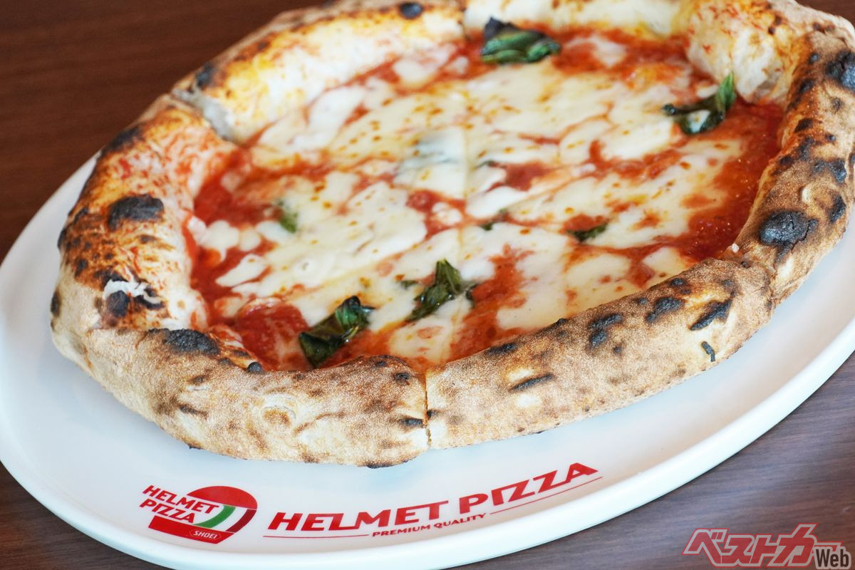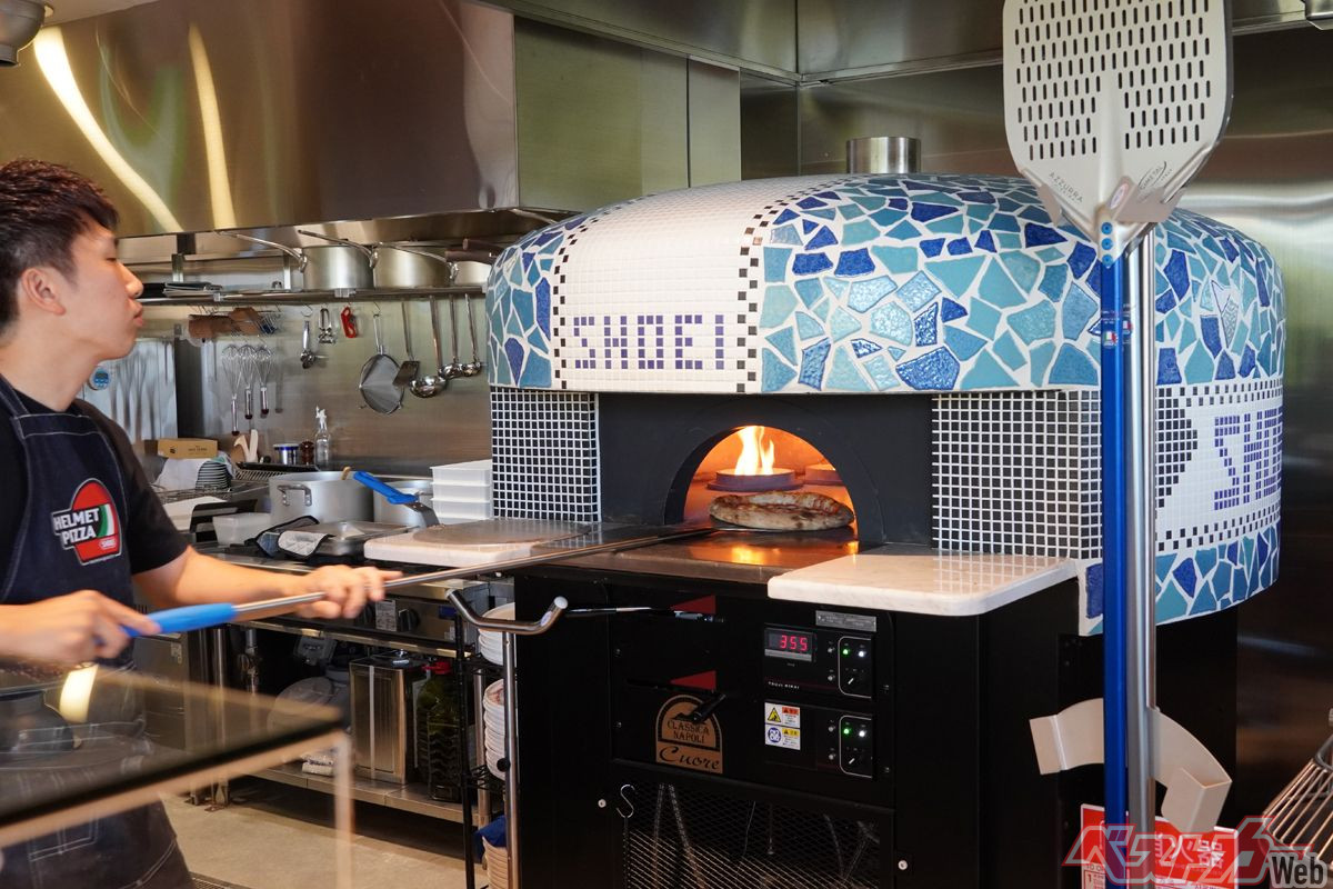 そして、ヘルメットパークを訪れたら必ず立ち寄りたいのがピザレストラン「HELMET PIZZA」 だ。店内には本格的な石窯が設置され、メニューはナポリピッツァ職人の日本チャンピオンを獲得した有名店が監修。定番のマルゲリータから、SHOEI契約ライダーのマルケス兄弟やファビオ・ディ・ジャンアントニオ、トプラク・ラズガットリオグルにちなんだスペシャルまで、豊富な種類の本格ピザが楽しめる。