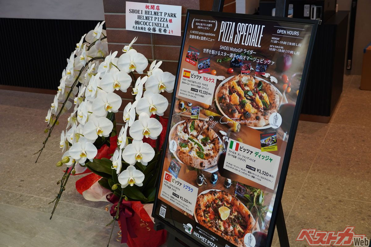 メニューは茨城県守谷市の名店「IL NESSO pizza naoletana」が監修。SHOEI契約ライダーの名を冠したスペシャルピザは、マルケス兄弟がスペイン、ディジャがイタリア、トプラクがトルコと、出身国にちなんだ素材が使われる。