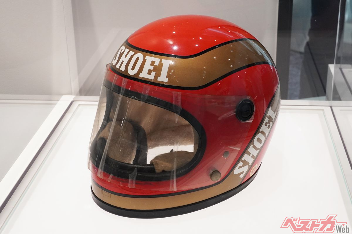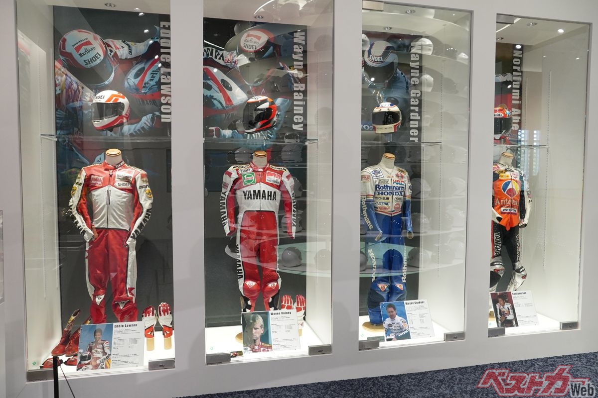 左からローソン、レイニー、ガードナー、ノリックと、SHOEIを被ったGPライダーのヘルメットを装備品とともに展示。
