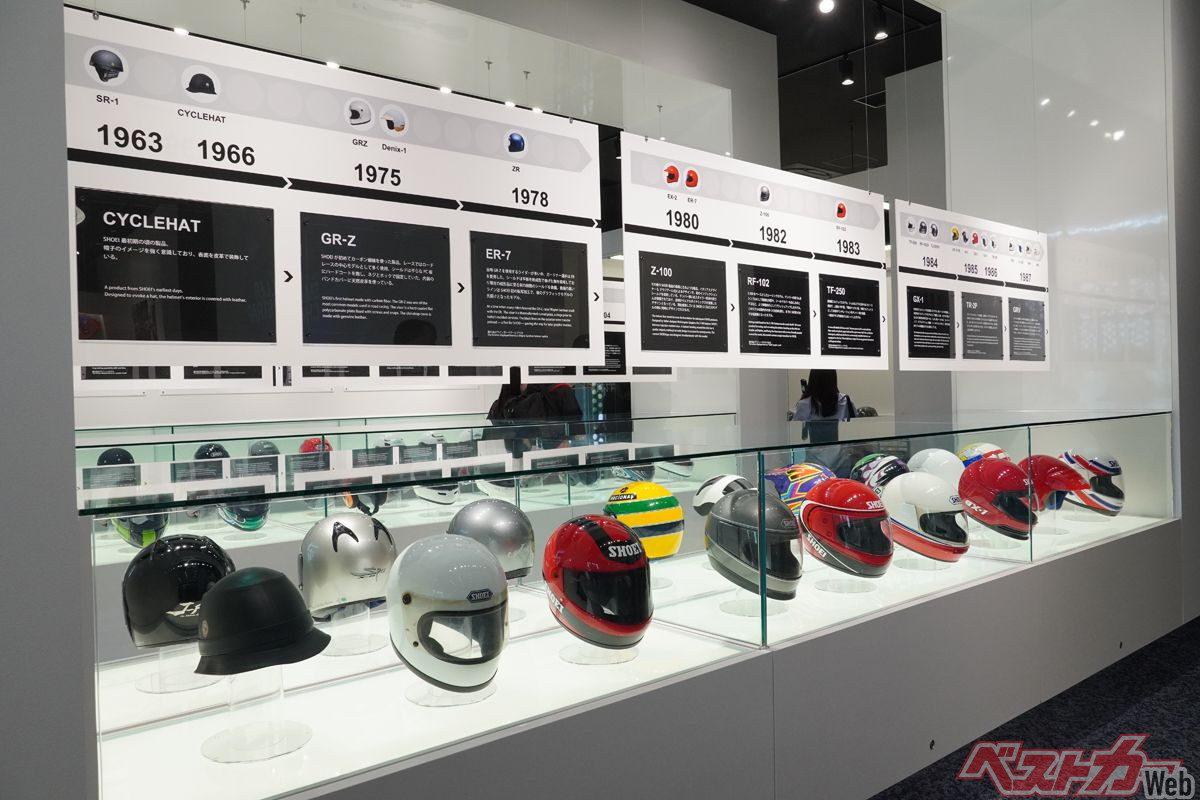 創業当初から現在まで、SHOEIの歴史的モデルがずらりと並ぶ。
