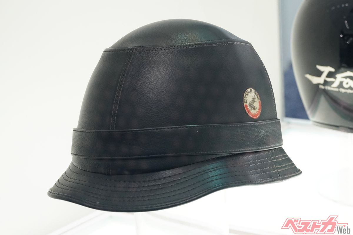 ヘルメットパークに展示される最も古いSHOEI製ヘルメット「CYCLEHAT」。表面は革張りで、帽子のようなツバがチャーミング。