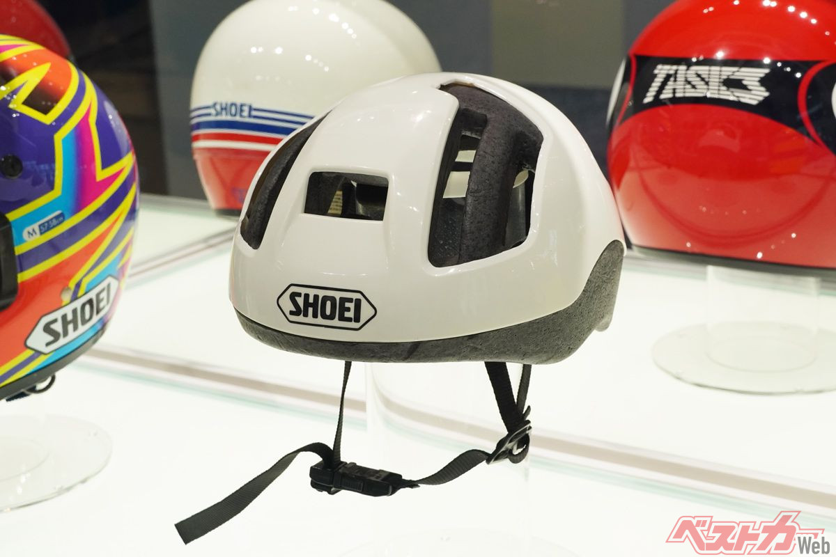 貴重なSHOEIの歴代ヘルメット展示も見物だ。同社が保有する中で最も古い二輪用の「サイクルハット」という製品や、1992年に製造された自転車用ヘルメット、海外で異常な高価格で取引される「JフォースⅡ」など、同社のヘルメットが辿ってきた進化の歴史が一望できる。
