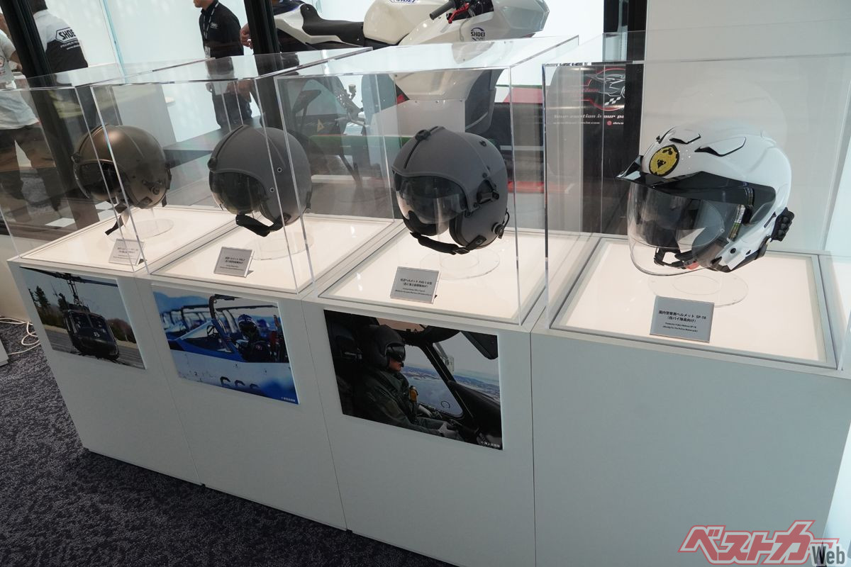 SHOEIが納入する官公庁用ヘルメット。面白いのは航空用ヘルメットで、陸上自衛隊/海上自衛隊/航空自衛隊で全て仕様が異なるのだという。