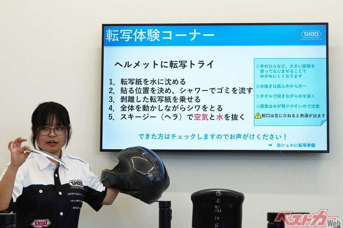 転写シールの貼り付けに挑戦する体験コーナー。まずはスタッフの説明を聞き…