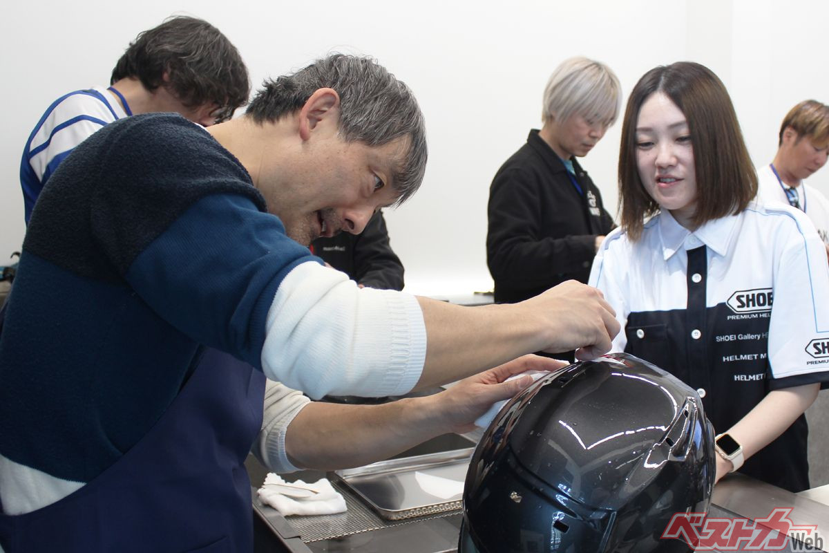上手くいった!と思っても、厳しいスタッフからダメ出しを受ける(笑)。SHOEIでは通常、1年ほどの修行が必要な作業とのこと。