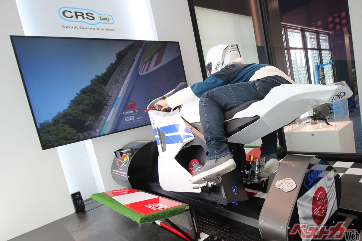 また、「バイクシミュレーション」では、最新のフラッグシップモデル「X-Fifteen」を被り、MotoGPライダーのもてぎでの走行映像や、鈴鹿サーキットの映像に合わせて筐体が自動で傾斜するリアルな挙動を体感できる(1プレイ500円)。