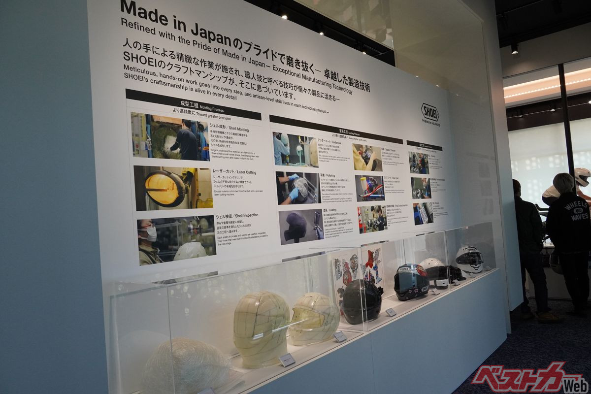 さらに奥のエリアではヘルメットの製造工程も解説。ガラス繊維状態から成形、レーザーカット、塗装、ライナーやパーツの組み立てに至るまでを「展示。併設のシアターでは、ヘルメットが製造される様子や衝撃試験の映像なども上映されている。