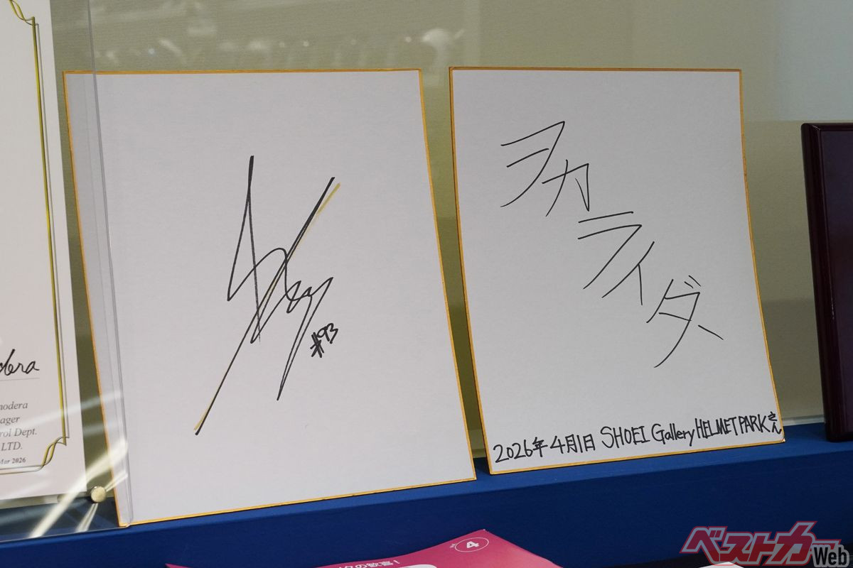 さらに現役SHOEI契約ライダーの装備品に加え、エディ・ローソンやワイン・ガードナー、ウェイン・レイニー、阿部典史といった過去の名ライダーのヘルメットや装備品も展示。古いものでは1970年代の片山敬済や、アイルトン・セナ/ジャン・アレジといったF1レーサーの4輪用など、他ではなかなか見られない歴史的製品も並ぶ。