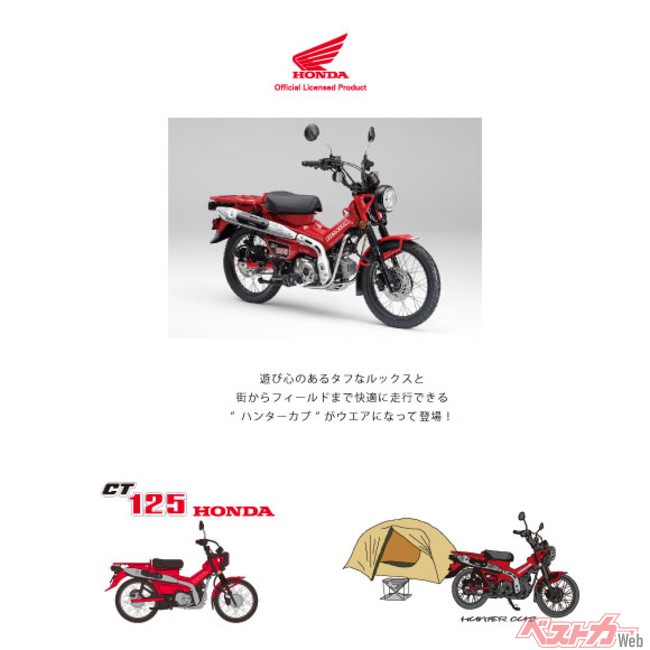 大人気のHONDA CT125 ハンターカブ。近年のアウトドアブームで更に人気が高まった自由で遊び心のあるハンターカブについにグッズが登場! ウエアでハンターカブの世界観をそのままに、本田技研工業(株)公認のライセンス取得で販売を開始します。