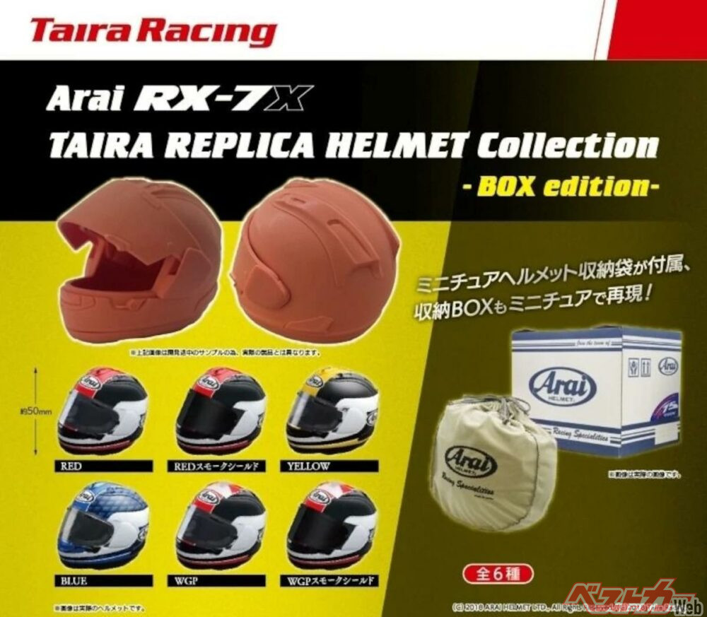 Araiのヘルメットが完成塗装済みフィギュアとして登場! 約50㎜とミニチュアサイズで、GPライダー平忠彦のレプリカモデル6種類のコンプリートセットである。さらにミニチュアヘルメット袋と収納BOXも付属し、価格は税込4620円だ。
