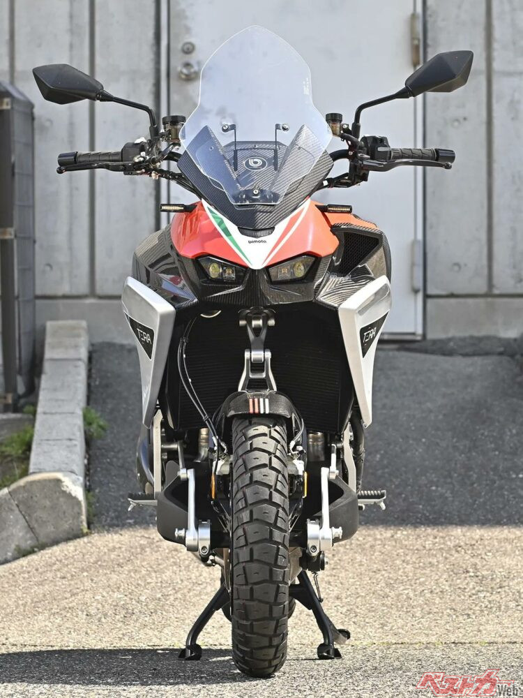 今回、日本で初公開された「TERA」はビモータとしては珍しいクロスオーバーモデルで、快適性を求めたシートや、グリップヒーター、USB電源ソケット、パニアケースなどおよそビモータらしくない装備が用意されている。