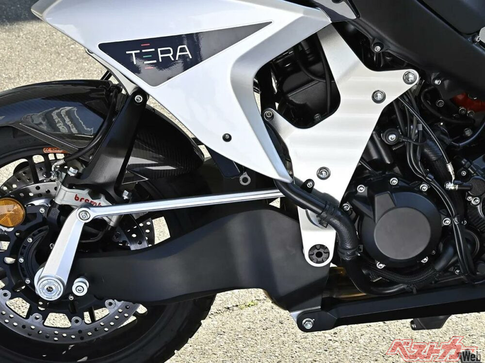 「TERA」のフレームは「TESI H2」のフレームを進化させた新設計のもので、エンジンをストレスメンバーとして削り出しのアルミによって構成されている。実車で確認すると、フレームを構成するアルミ製部品は非常に高い精度で美しく仕上げられており、外装部品を兼ねたシートレールは内部にリブ加工が施されている。ボディパーツの素材には基本的にカーボンが使用されており、そのコントラストがビモータ独自の機能美を生み出している。
