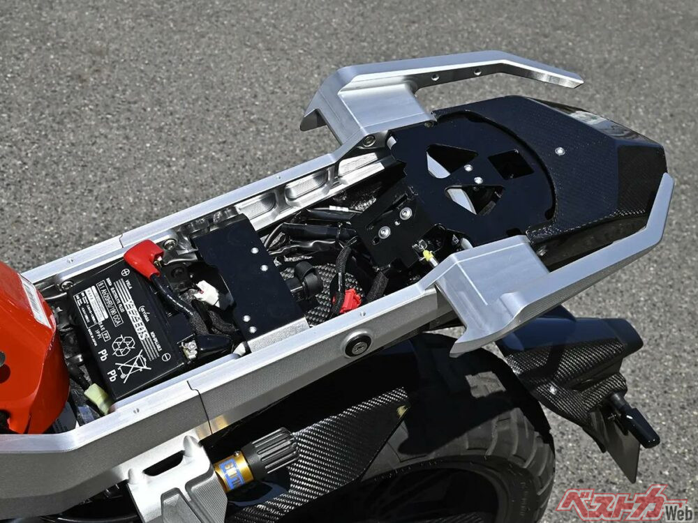 外装とシートレールを兼ねたパーツの内部はリブ状に加工されており、カーボン製のプレートの上に電装品が搭載される。