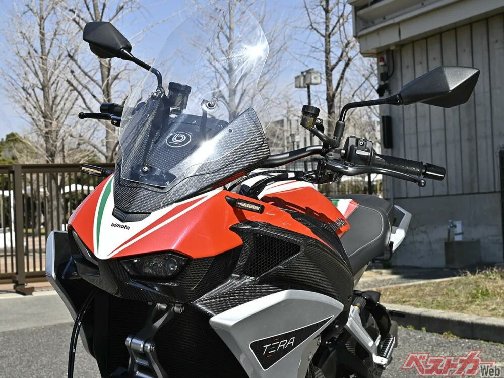 カウルはカーボン製で、高さのあるスクリーンを組み合わせる。高速での長距離ツーリングなどで効果を発揮するはずだ。