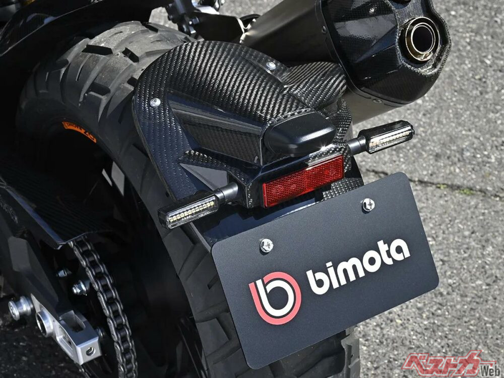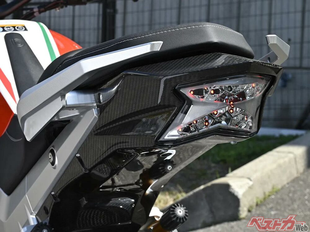 カーボン製のテールカウルにLEDタイプのテールライトが埋め込まれ、個性的なデザインにまとめられている。