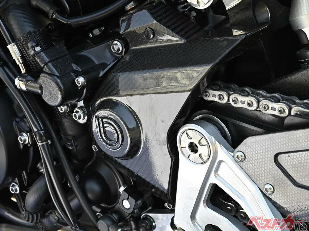 駆動方式はベーシックなチェーン式で、スプロケットカバーもカーボンで製作されている。