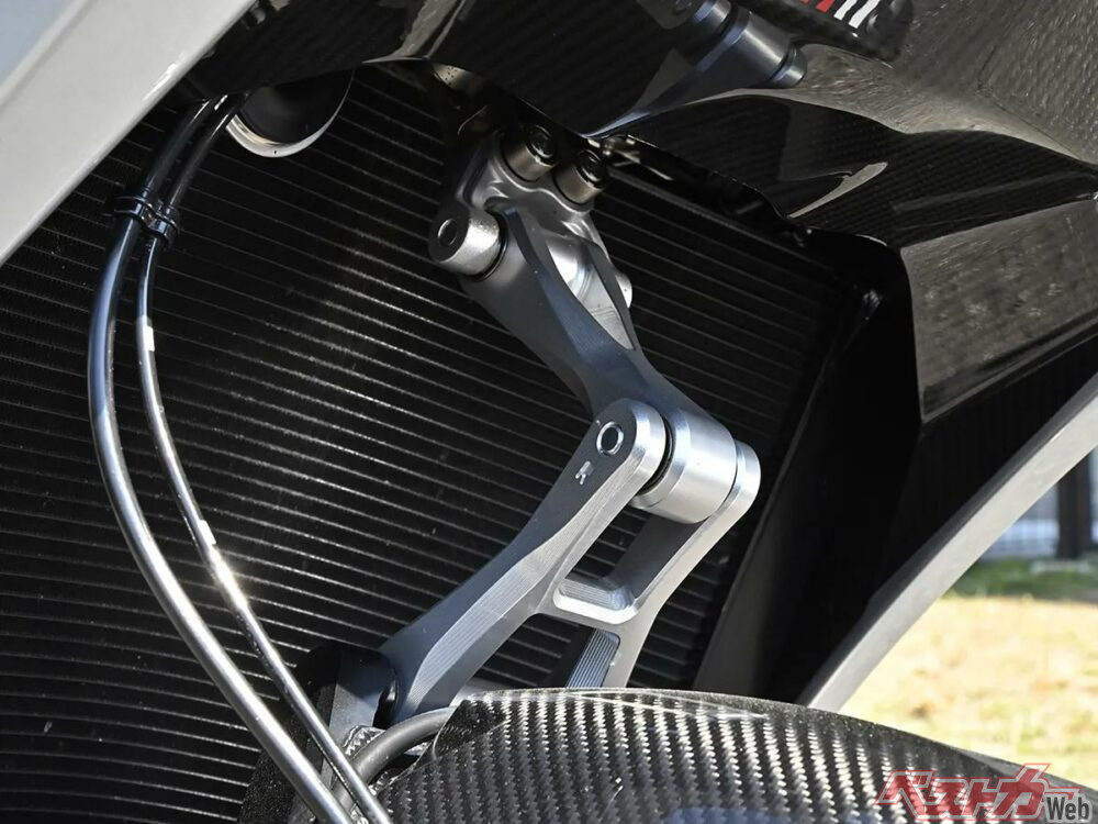 エンジンをストレスメンバーとするシャーシ構造を採用。エンジンの横に大きな削り出しアルミ製のフロントフレームが取り付けられる。