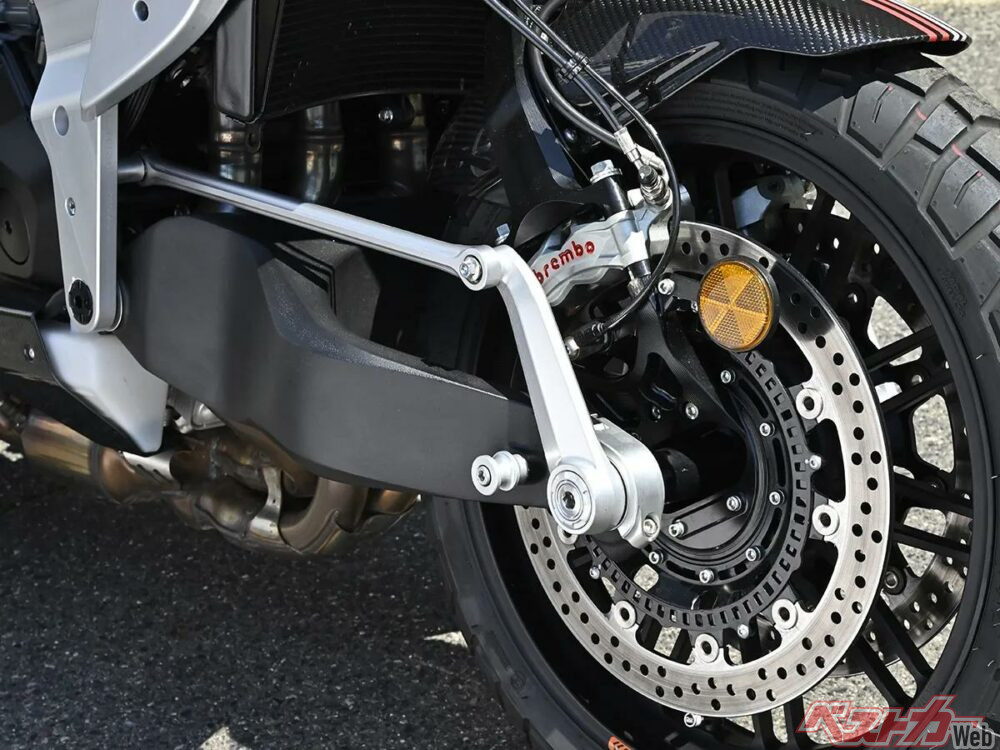 ブラック仕上げとなるフロントのスイングアーム。ブレーキシステムはブレンボ製が装着されている。