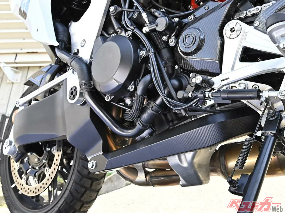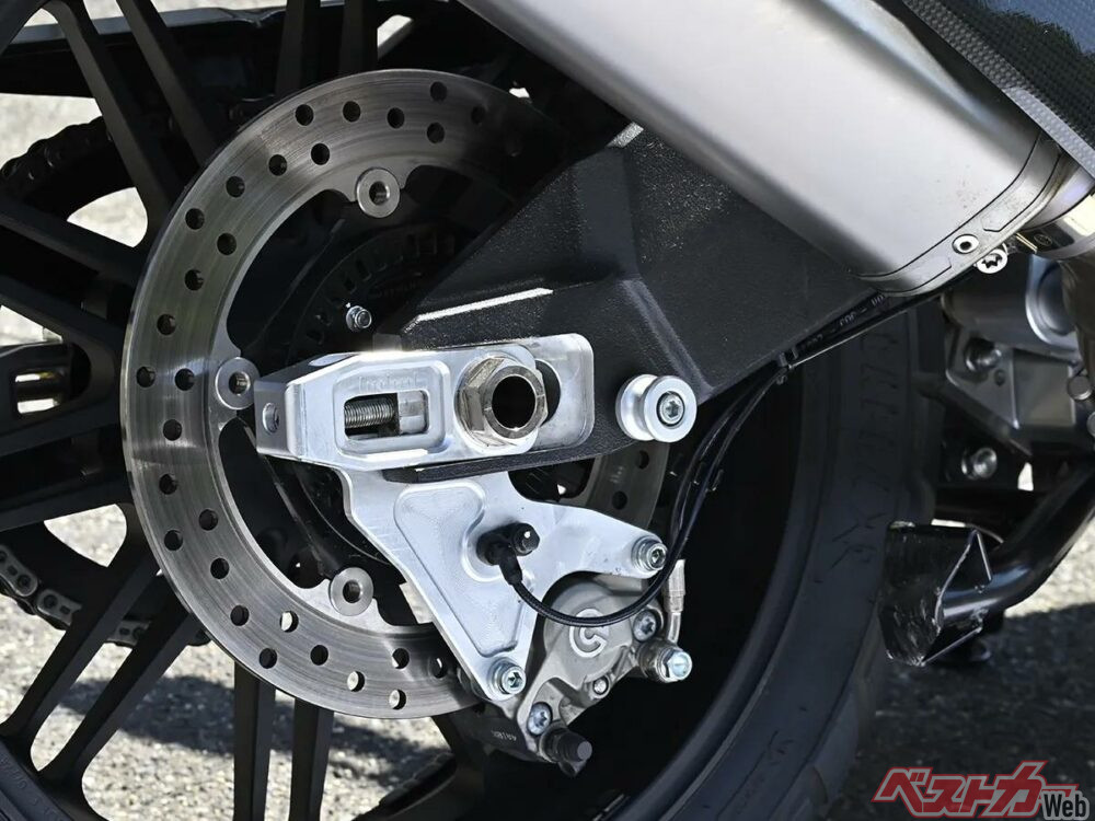 リアブレーキにもブレンボ製のキャリパーを装着し、アルミ削り出しのキャリパーサポートを介して取り付けられる。