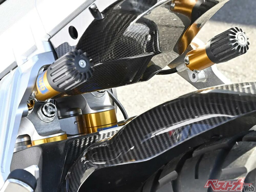 前後のスイングアームはブラックアルマイト仕上げとされ、ブラックでペイントされたホイールやエンジンとエンジンから足回りにかけてを引き締める。サスペンションは「TESI H2」と同様に前後のショックユニットがシート下に並べて配置されており、撮影車のサスペンションは前後とも標準のオーリンズ製TTX36が装着されていたが、オプションでマルゾッキ製の電子制御サスペンションが用意されている。このルゾッキ製の電子制御サスペンションを装着すると、標準のオーリンズ製のフロント114mm/リヤ135mmというホイールトラベルが、フロント145mm /リア165mmへと拡大する。