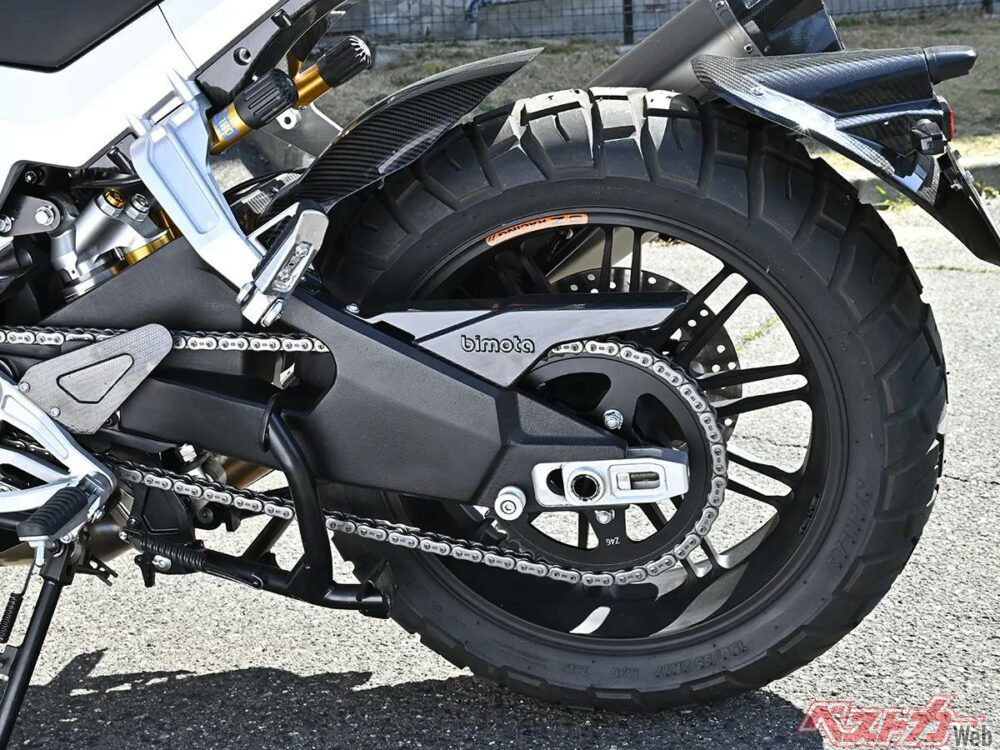スイングアームはかなりゴツい印象を受けるアルミ製で、190mm幅のセミブロックタイヤを支える。