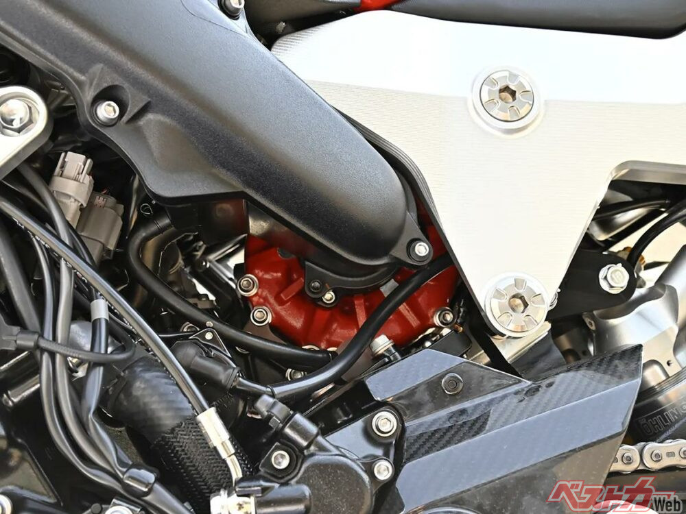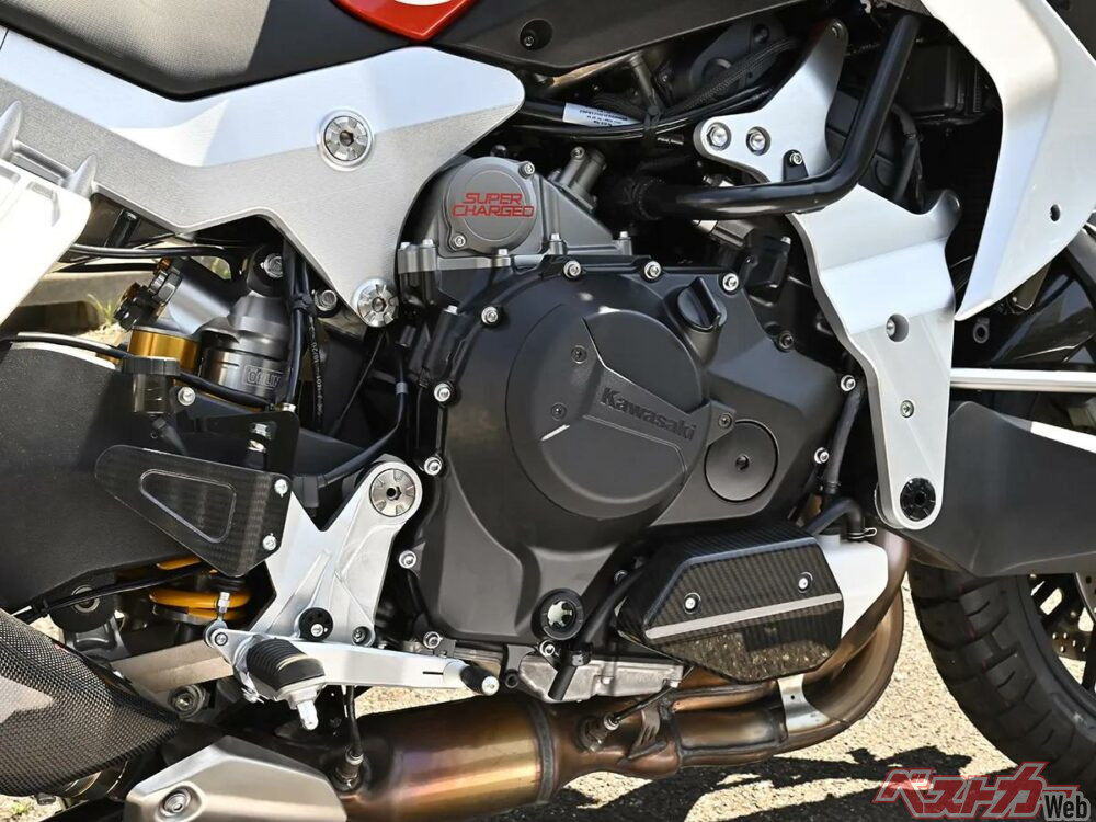 パワーユニットはカワサキのH2系で、電子制御系も基本的に継承している。スーパーチャージャー付きの水冷DOHC4バルブ直列4気筒ユニットは、998ccの排気量から最高出力147.1kW(200PS)/11000rpm、最大トルク137N・m(13.9kgm)/8500rpmというスペック。