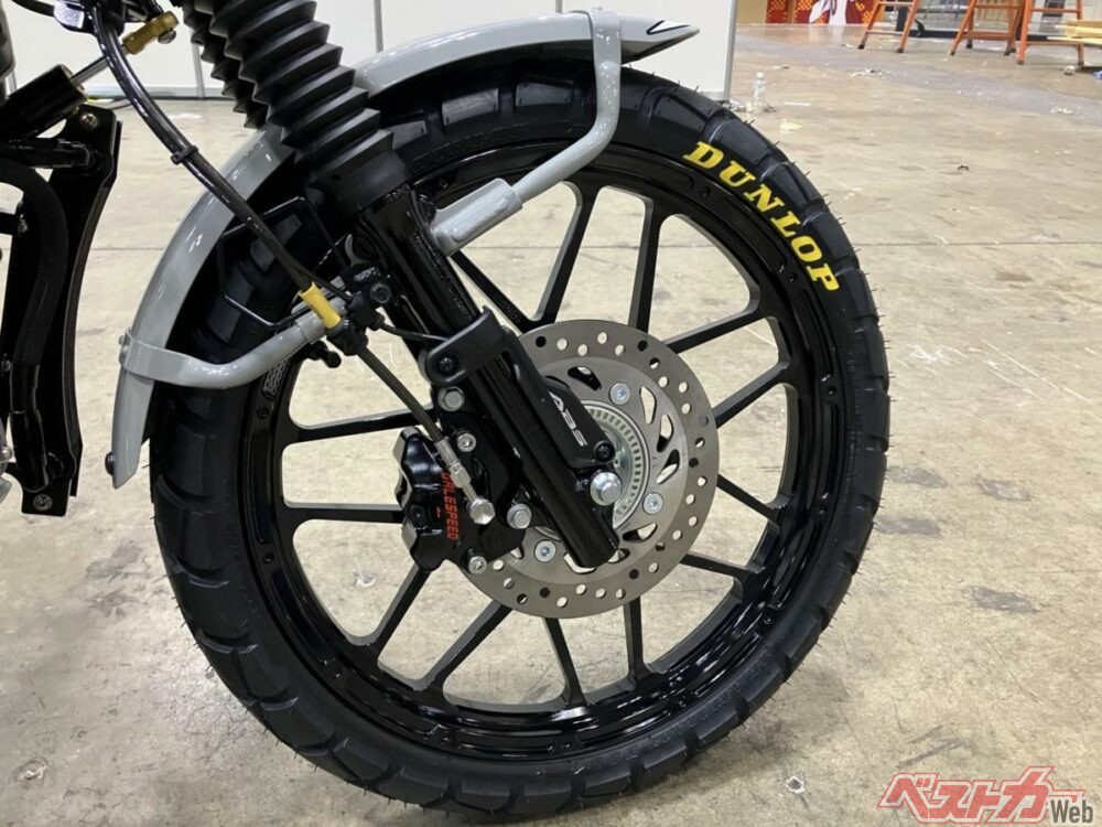 まずホイールはGALE SPEED(ゲイルスピード)の新作アルミ鍛造ホイール「Type-X」を装備。ラフロードにも強いクロスカントリー風ホイールで、四輪ホイールのようなタフなイメージを持つ。その名の通りX(クロス)メッシュスポークのデザインでオフロード走行も想定し、リムフランジ部に強度を持たせている。チューブレス化できることも大きなメリットといえるだろう。こちらは8月にデリバリー予定だ。