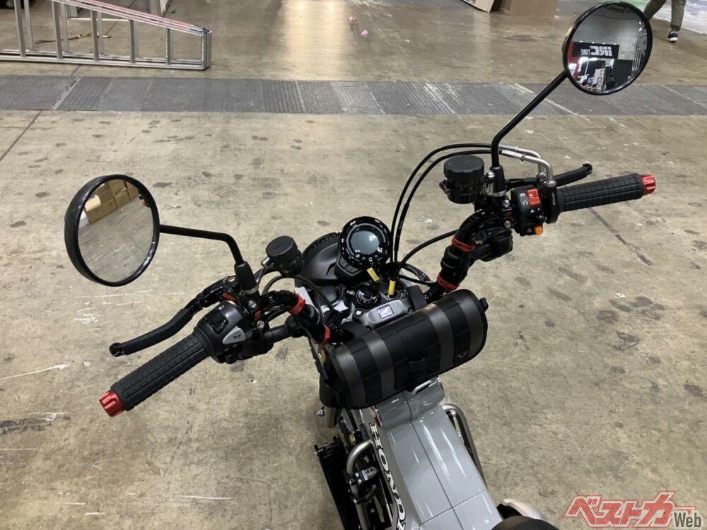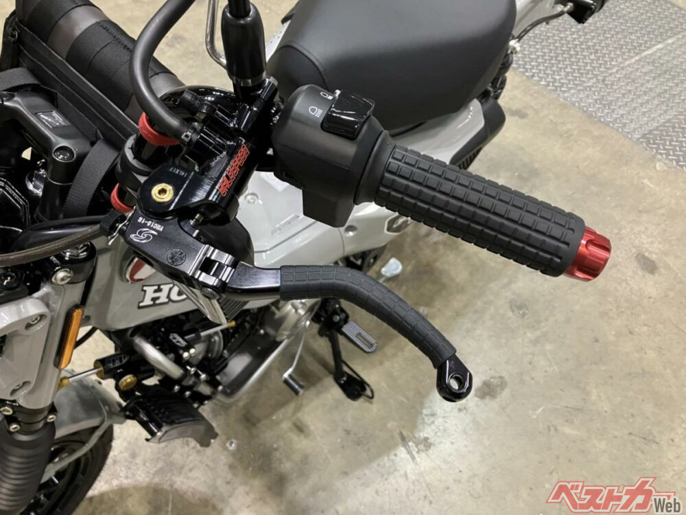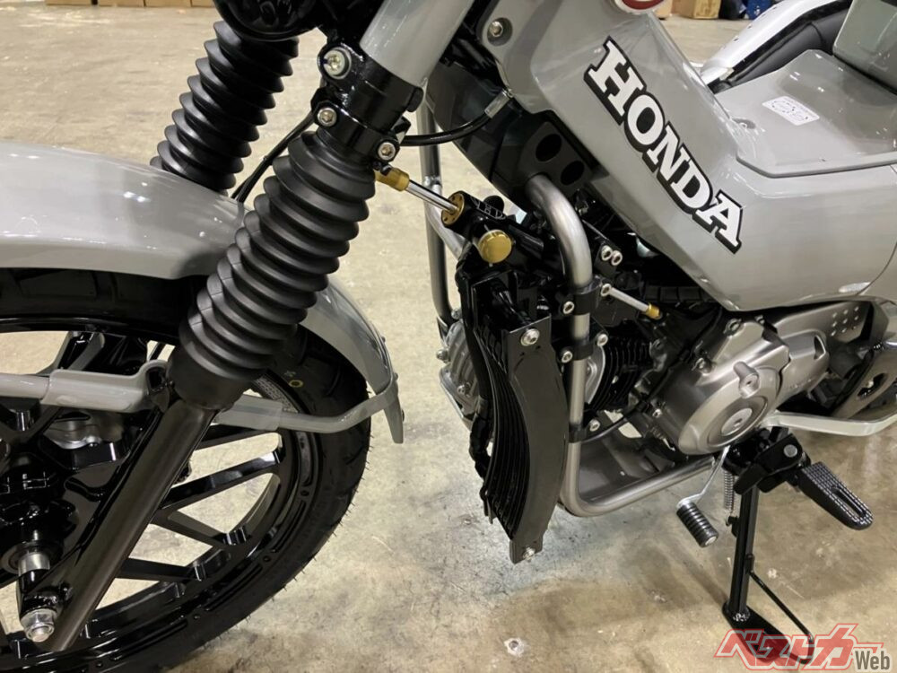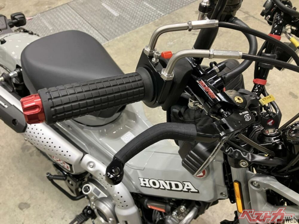 そのほかすでに市販化されていて特徴的なパーツとしては、ゲイルスピードの「Elaborate VRE 左ブレーキマスター」だろう。その名の通りCT125に左ブレーキレバーを装着できるパーツで、右ふっとブレーキとABSを残したまま左手でリアブレーキを入力できるスグレモノである。ちなみにまだCT125用のキット化はしていないが、アクティブでは検討中とのこと。