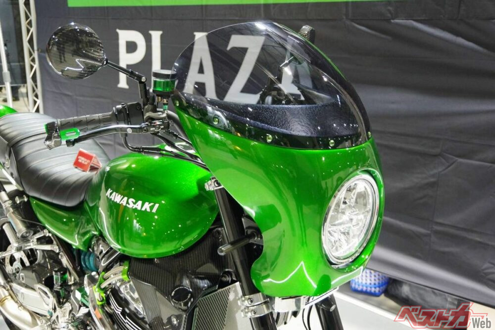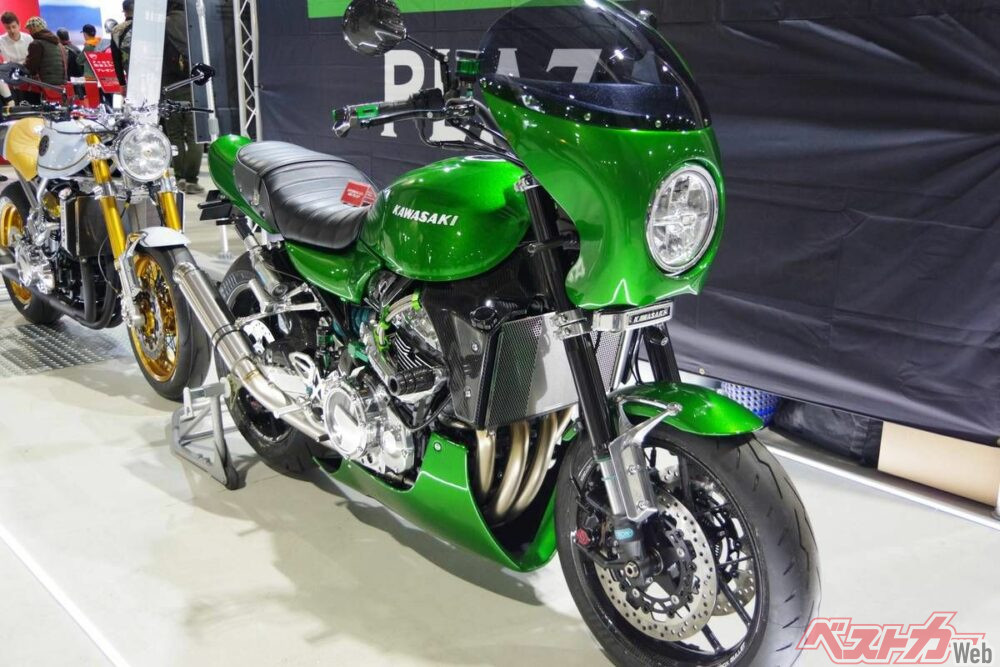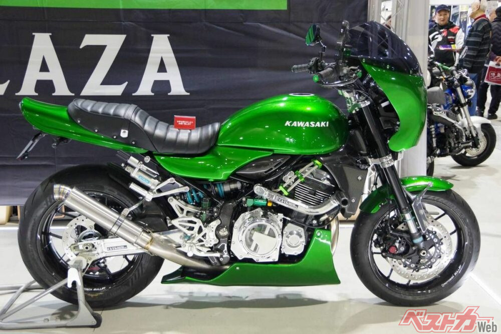 先日開催された名古屋モーターサイクルショーの会場で、ひときわ注目を集めていたカスタムマシンがあった。「カワサキプラザ名古屋緑」ブースに展示された2台のマシンは、Z900RSをベースに美しいカフェレーサースタイルを実現! 今回は大ぶりなビキニカウル&アンダーカウルを装着し、レーシーな雰囲気に包まれたマシンを紹介したい。