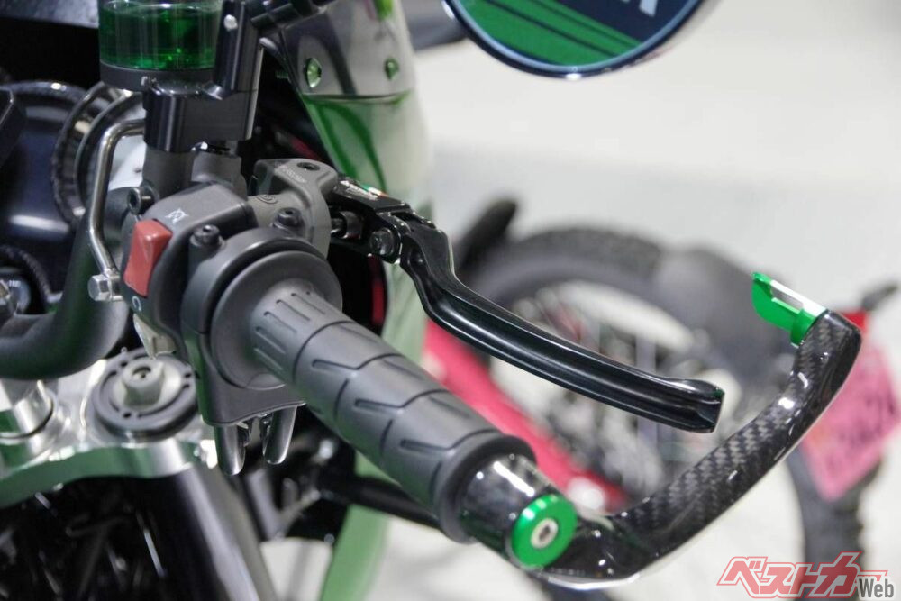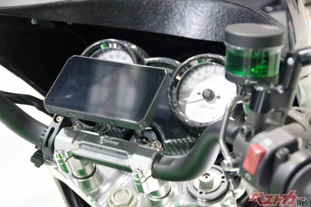 オーナーが常に目にするコクピットは純正メーターを活かしつつ、カーボンカバーでドレスアップ。スマートライドモニタを増設したG-STRIKERステムキットを備え、街乗りにも合わせた仕上がり。しかしレーシーなACCOSSATO製カーボンレバーガードを装着、ブレーキフルードがグリーンに変更されているのも、車体色とマッチしていてスキがない。