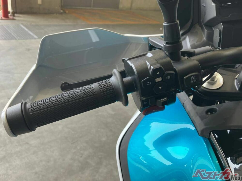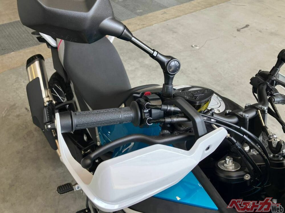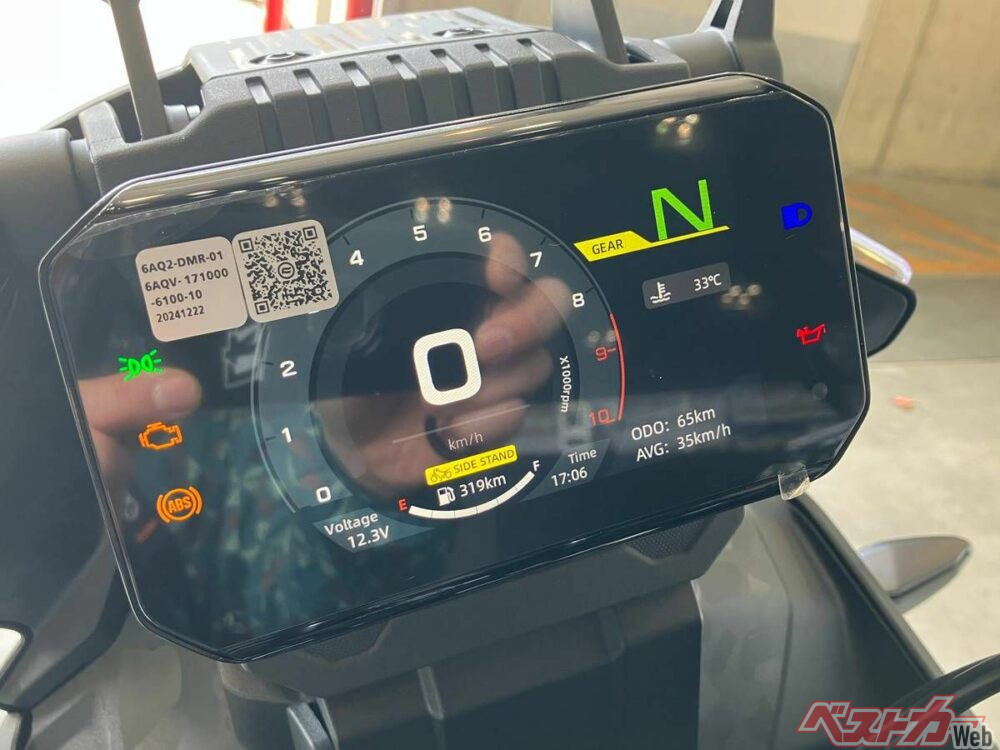装備面では、フロントサスペンションにはKYB製の圧縮&減衰調整可能なΦ41mm倒立フォークを採用し、リアショックもアジャスタブルで200mmのストロークを持つ高性能な足回りを備える。またCF-SCスリッパークラッチを標準装備、電子制御ではBOSCH製のデュアルチャンネルスイッチ式ABSやトラクションコントロールシステムを備えており、いずれも有名メーカー製のパーツで品質は保証済だ。これらの電制の状態をチェックできるメーターはワイドなフルカラーTFTモニタ、さらにコクピットには18WのUSB電源も備えている。このように大排気量アドベンチャーと並ぶ充実した設計&装備の450MTだが、車体サイズは排気量なみのコンパクトさを実現しており、最低地上高は220mmが確保されつつ、シート高800mm~820mmと足つきも考慮。装備重量は185kgと、かなり軽量な仕上がりで引き起こしも快適だ。