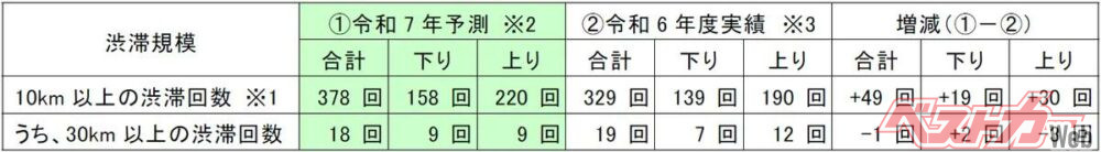 令和6年(昨年)のゴールデンウィーク期間との渋滞回数の比較は以下のとおり。なお、令和6年の実績には、事故などの影響による渋滞が含まれている。