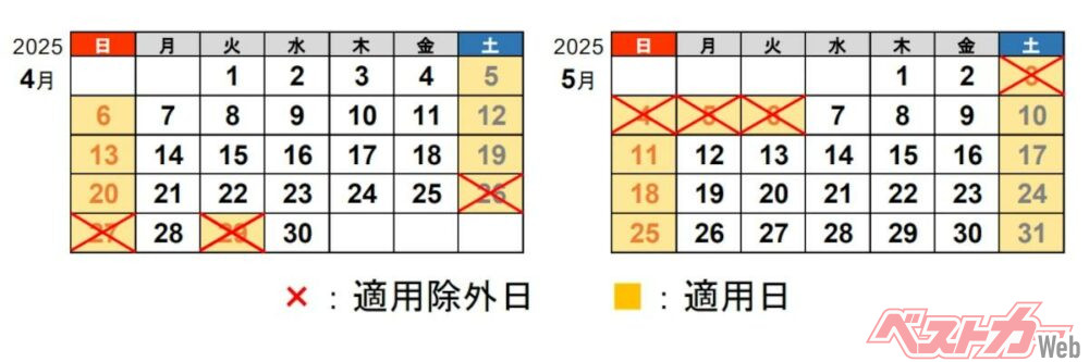 渋滞の激化を避けるため、ゴールデンウイーク中はETC休日割引が適用されないため、料金に注意が必要だ。