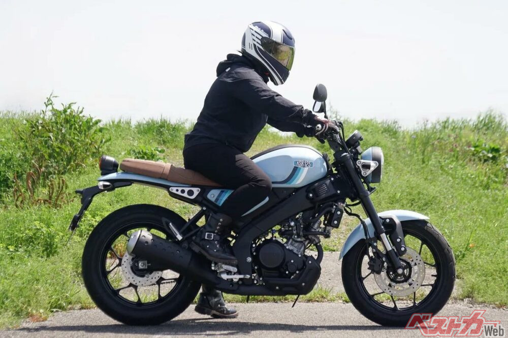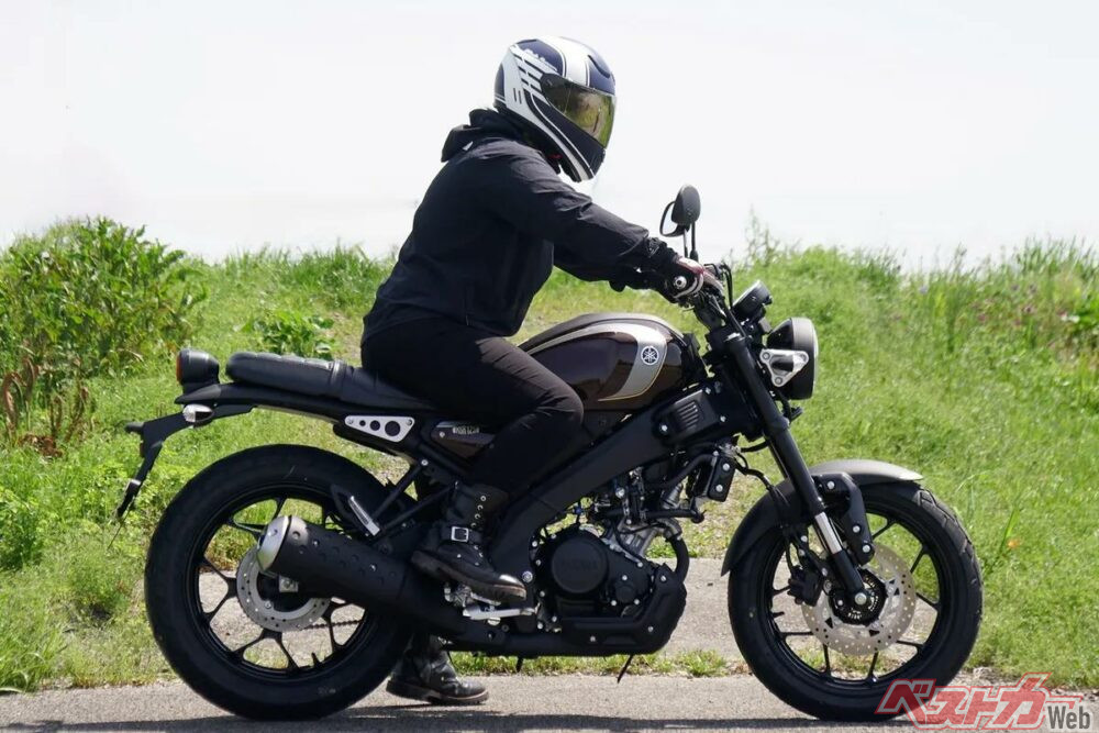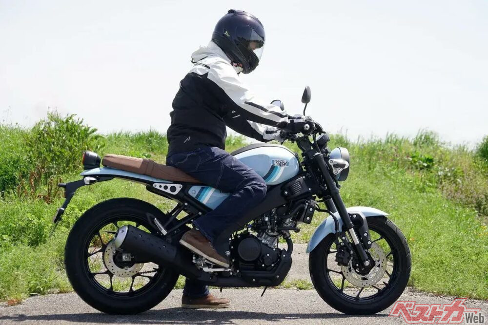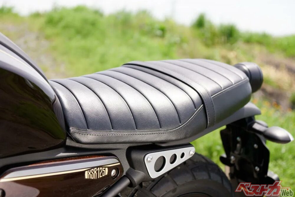 ヘッドランプ、テールランプ、メーターに丸型を採用し、モールサイドカバーとマフラープロテクターには丸型の肉抜き加工を施し、XSRシリーズらしいネオレトロなスタイルを実現しているXSR125。フレームはスーパースポーツ「YZF-R125」、スポーツ・ネイキッド「MT-125」と共有しているが、アップハンドルとタックロールシートが自由度の高いライディングポジションを実現し、車重は137kgと上記2台を含めて最軽量に収まり、良好な取りまわしとなっている。