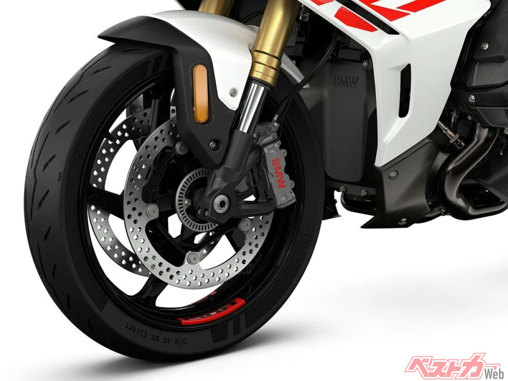 フロントフォークは倒立タイプで、新型電子式ダイナミックサスペンションアジャストメント付きの場合、量産バイクとして初めてスプリングレートが調整可能となる。