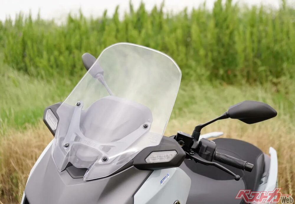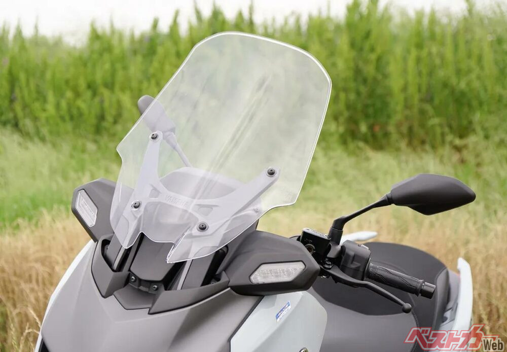その電動スクリーンは一番下げた状態でも高い整流効果を発揮する。ヘルメット上部に走行風が当たるのを感じたが、上半身には風圧を感じず、快適にライディングできたからだ。スクリーンの位置調整も左手だけで操作でき、作動がスムーズで無段階に調整可能なのも使いやすさとして感じられた。
