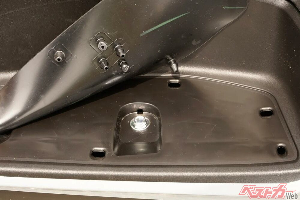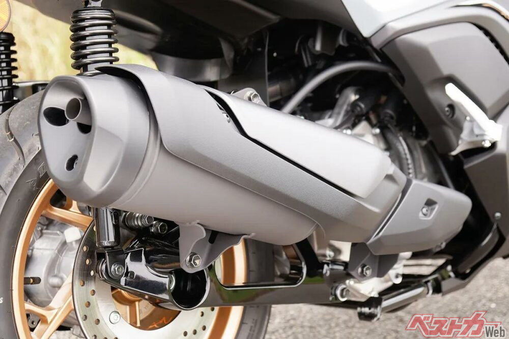 (5)熱がこもらない工夫も旧モデルから引き継いでいるものだが、マフラーとリヤカウル下の隙間に熱を逃す穴を設けている。シート下トランクに、マフラーやエンジンの排熱が滞留するのを防ぐ効果を発揮する。