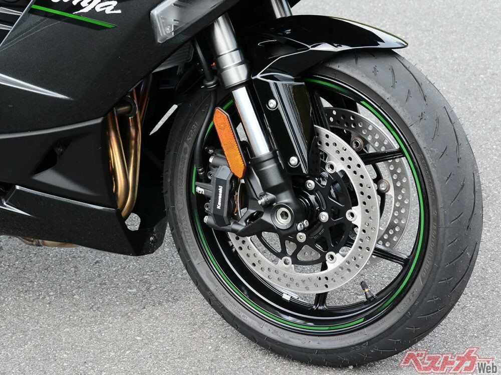 「Ninja 1100SX」と「Ninja 1100SX SE」の大きな違いは足回りである。まずフロント周りだが、フロントフォークは「Ninja 1100SX」、「Ninja 1100SX SE」共に41mm径フルアジャスタブルタイプ倒立フォークを装備する。ブレーキは「Ninja 1100SX」がKawasakiロゴ入りのラジアルマウントモノブロック対向4ピストン+300mm径デュアルセミフローティングディスクなのに対して、「Ninja1100SX SE」にはブレンボ製M4.32モノブロックタイプラジアルマウント対向4ピストンキャリパー+300mm径ブレンボ製デュアルセミフローティングディスクが装備される。