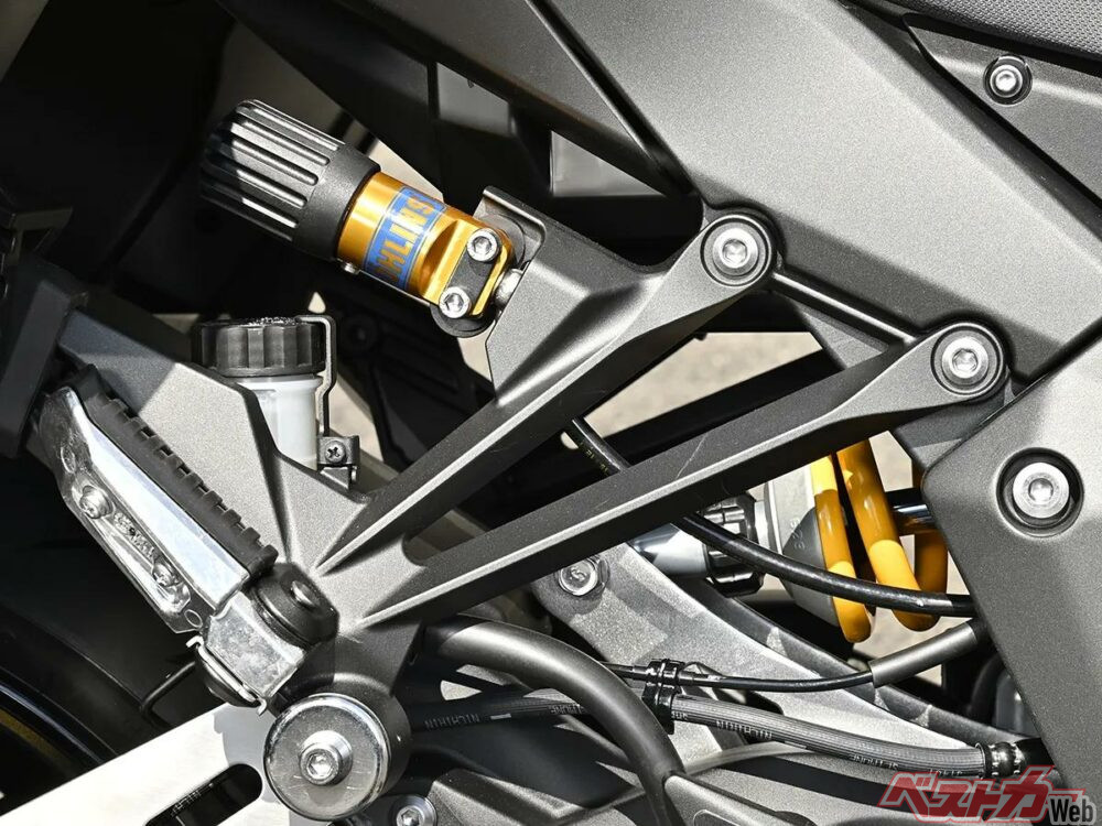 リアサスペンションは「Ninja1100SX」がフルアジャスタブルタイプのホリゾンタルバックリンク、「Ninja1100SX SE」にはフルアジャスタブルタイプのホリゾンタルバックリンクは同様だが、ÖHLINS製のS46ガスショックが奢られている。