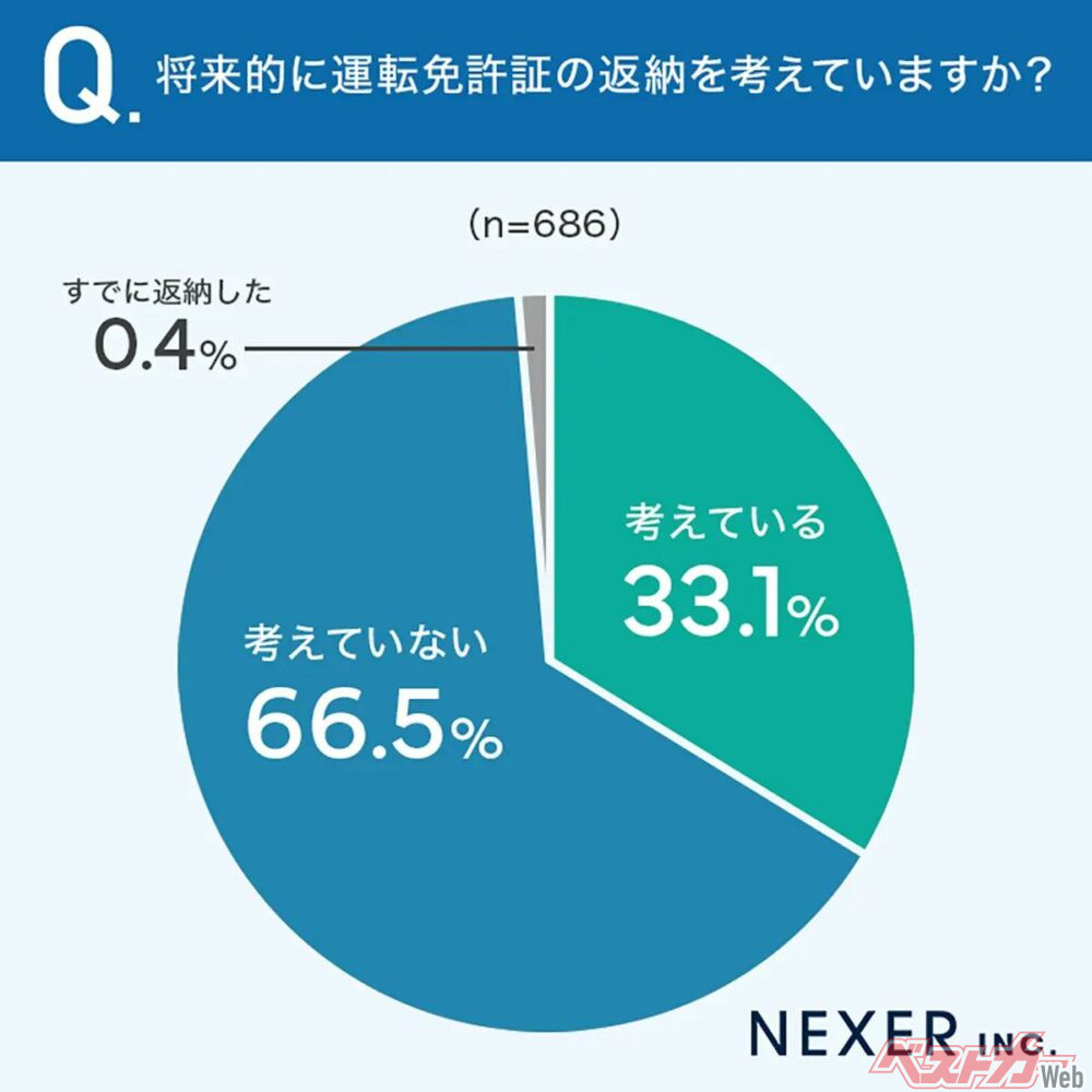 まず、「将来的に運転免許証の返納を考えているか」という質問では、33.1%が将来的に運転免許証の返納を「考えている」と回答した。その理由は以下の通りだ。