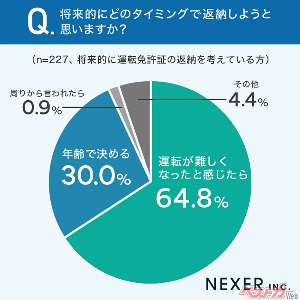 最も多かったのは「運転が難しくなったと感じたら」(64.8%)という回答だ。次いで、「年齢で決める」が30%、「周りから言われたら」が0.9%とつづき、自分の意思で返納しようと考えている人が多いことが分かった。