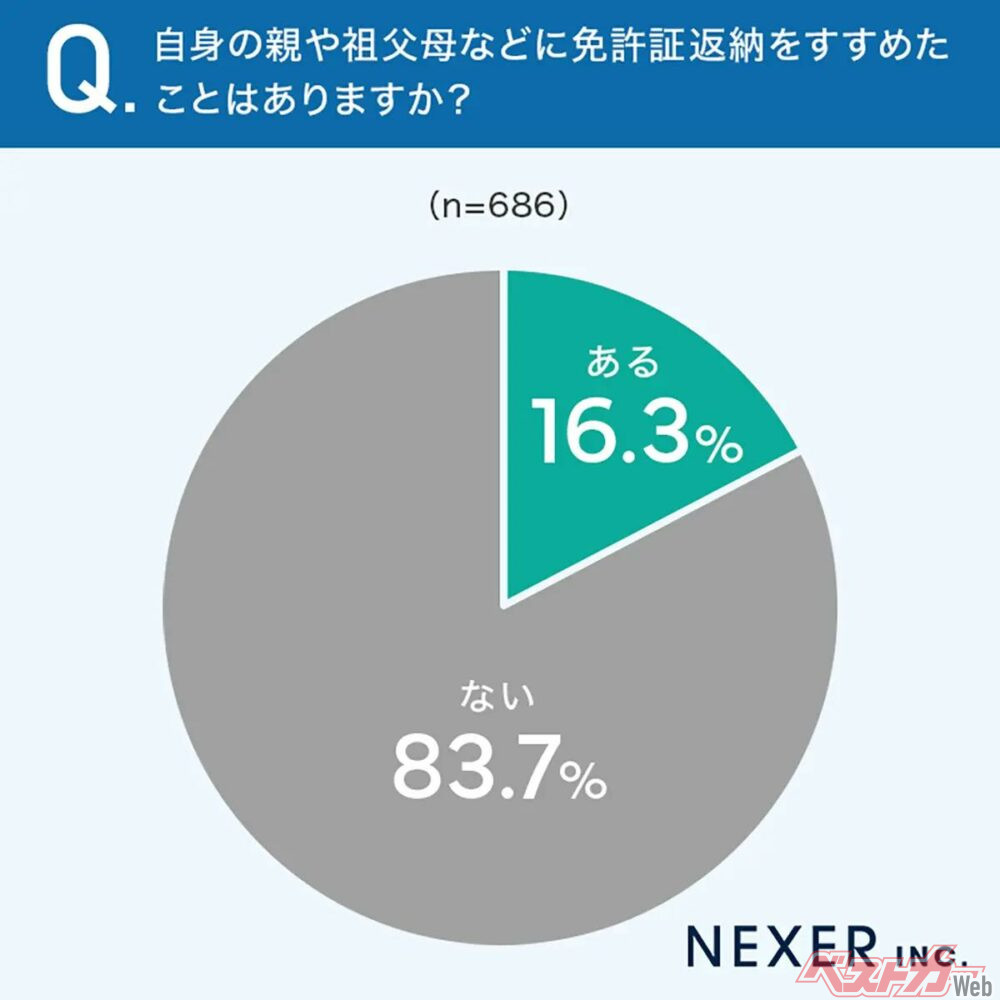 16.3%が自身の親や祖父母などに免許証返納をすすめたことが「ある」