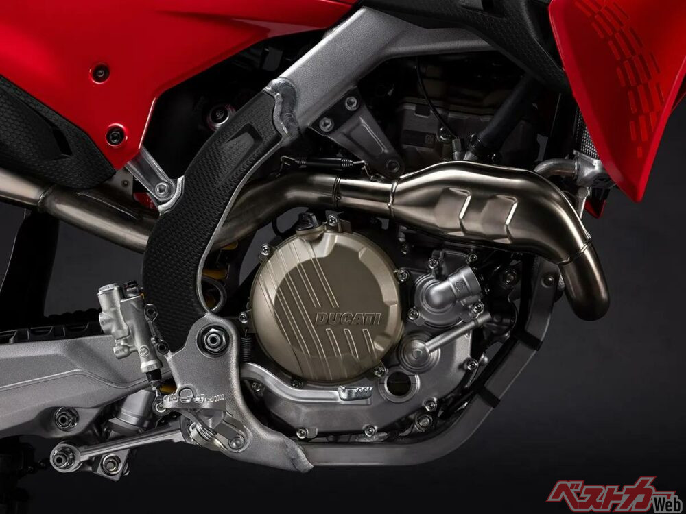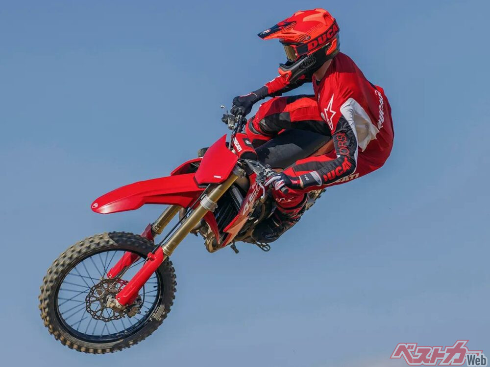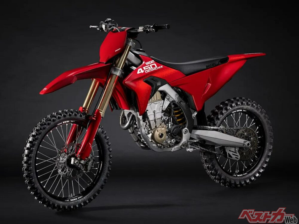 ドゥカティ初のモトクロスバイクとなる「DESMO450 MX」は、デスモドロミック機構を持つ449.6ccの単気筒エンジンをアルミニウム製のペリメーターフレームに搭載し、車両重量は104.8kgに仕上げられている。新設計となるデスモ450エンジンはボア×ストロークが96×62.1 mmにが設定され、インテーク40mm、エキゾースト33mmというバルブサイズを採用。最高出力は46.7kW(63.5hp)/9400rpm、最大トルクは53.5N・m/7500rpmで、4200rpmで最大トルクの70%を発生する。サスペンションは前後ともショーワ製で、フロントフォークは310mmのトラベルを持つフルアジャスタブルの49mm倒立タイプ、リアショックアブソーバーはフルアジャスタブルで、ホイールトラベルは301mmとなっている。トラクションコントロールやローンチコントロール、エンジンブレーキコントロールといった電子制御システムも搭載している。