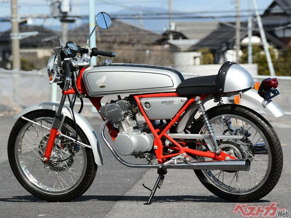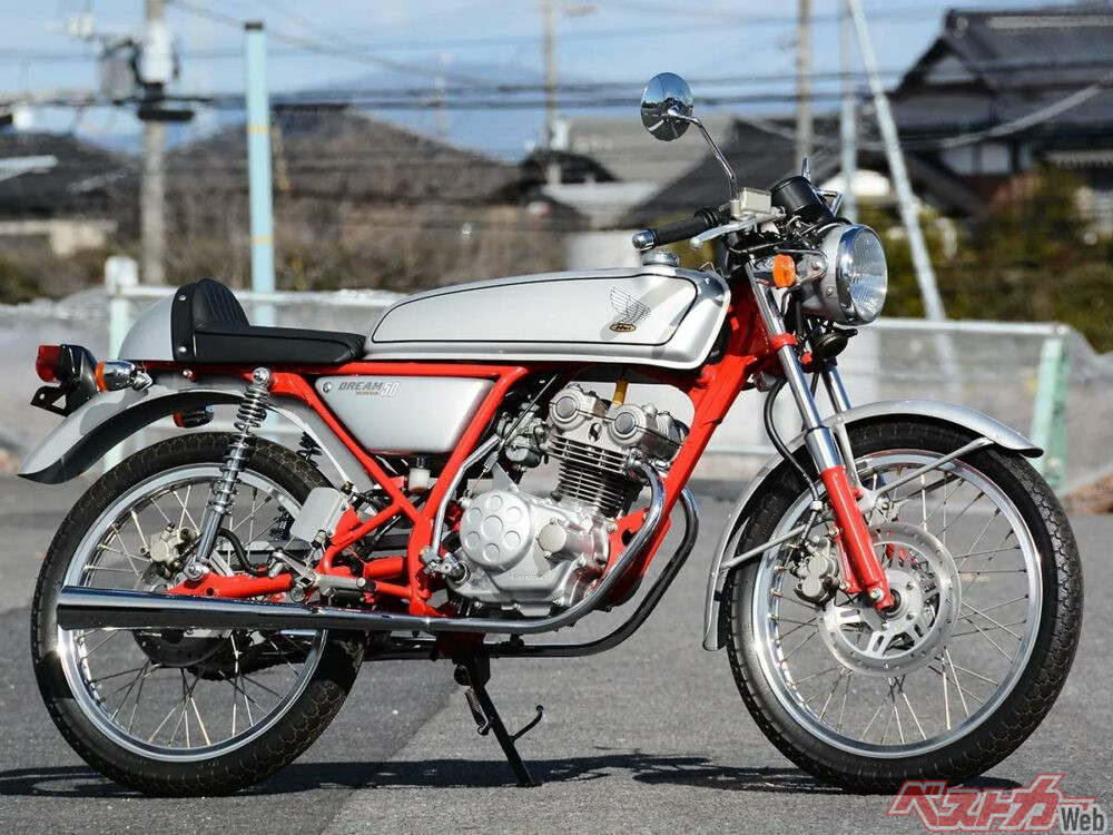 50ccのDOHCエンジンを搭載した「DREAM50」は、1960年台にWGPに挑戦したホンダのワークスレーサーRC110やその市販バージョンであるCR110をオマージュしたモデルであり、そのネーミングも含めてホンダの創業50年を記念するにふさわしいバイクであった。